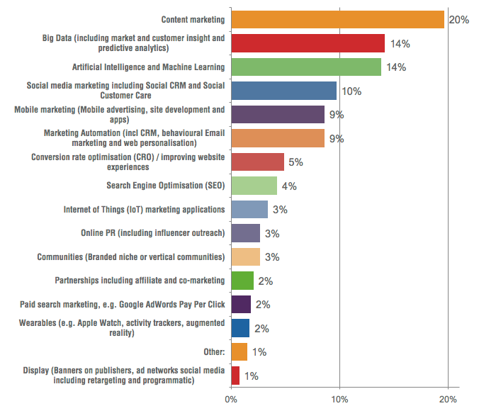 Por ejemplo, nos basamos en los datos de Smartinsights que han realizado una encuesta a 850 expertos en marketing digital sobre las nuevas tendencias que pueden funcionar en marketing digital para este 2018. Los resultados han sido estos:
