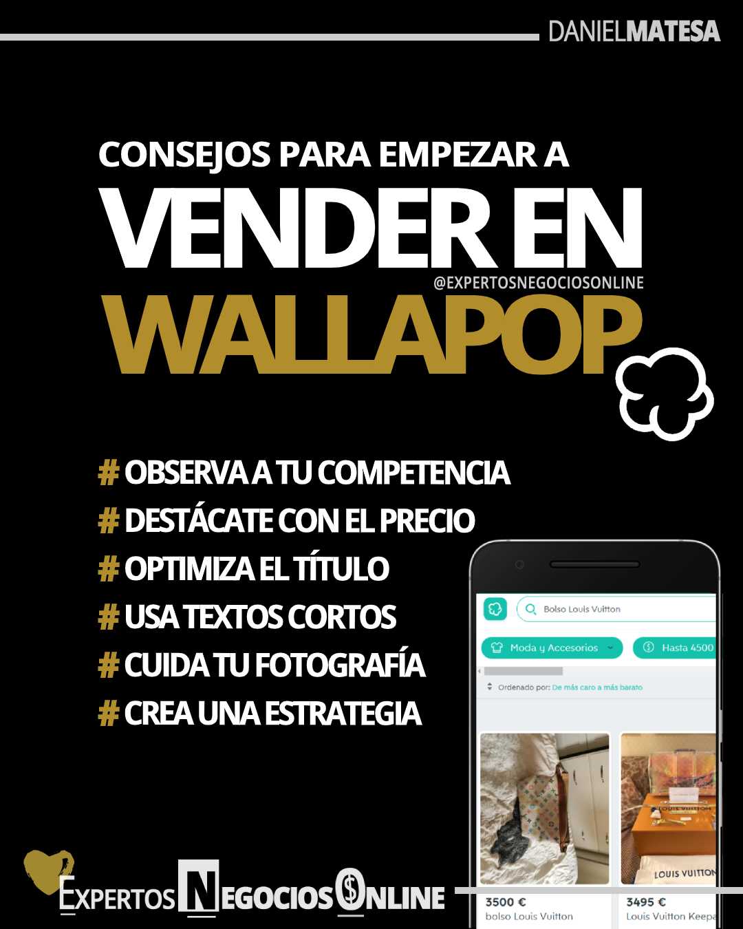 Hola, soy Daniel Matesa. Consultor estratégico de Negocios Online y ayudo a personas a conseguir éxito en Internet. Durante estos años trabajando en la creación, desarrollo y difusión de negocios online he adquirido muchos conocimientos y experiencias que voy exponiendo en este Blog de Negocios Online. No solo difundo mis conocimientos, sino que sigo realizando trabajos de forma independiente con emprendedores y empresas que quieren mejorar sus servicios online. Mis especialidades son: - Mejorar y gestionar un negocio online de forma completa, tanto web de servicios o tiendas online. - Desarrollar y potenciar la imagen de una marca en Internet. - Realizar estrategias para aumentar tráfico, conversión y ventas. - Analizar y desarrollar la venta de un producto por Internet. - Optimizar e impulsar negocios OFFLINE al mercado ONLINE, - Preparar procesos de venta de negocios online. - Crear estrategias para una eficiente comunicación multicanal. - Formaciones en Comercio electrónico y marketing digital. - Realizar y optimizar de campañas de marketing digital. #Ecommerce #MarketingDigital #Coach #Emprendedores #NegociosOnline